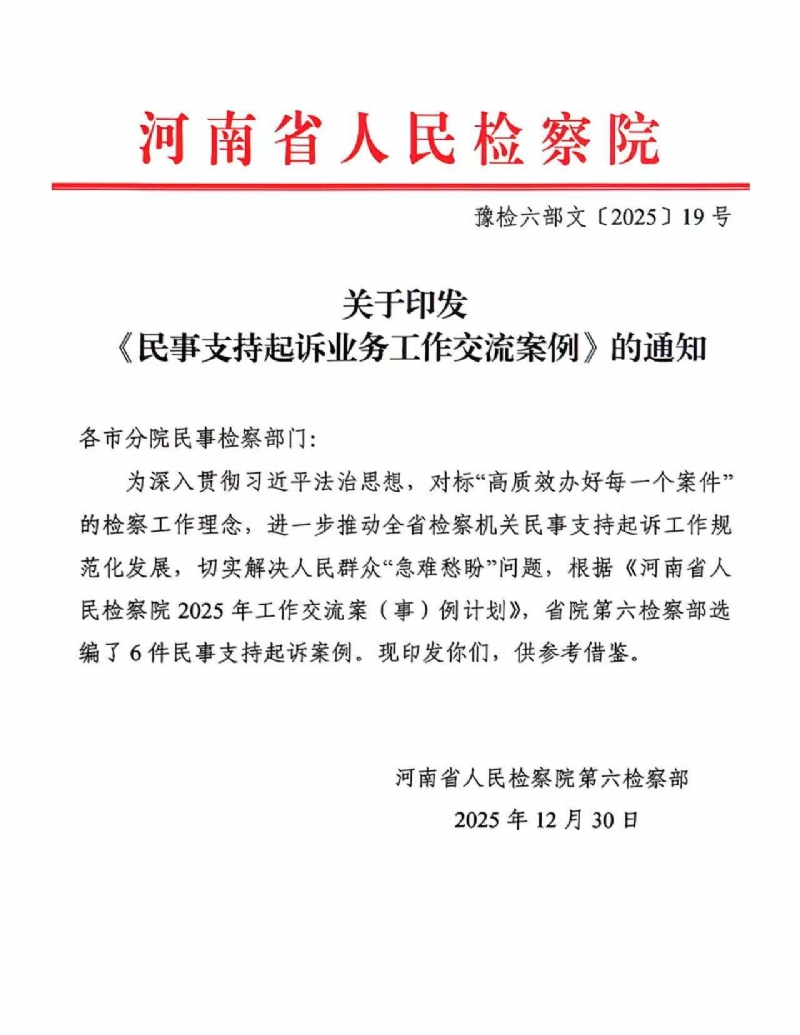 近日,河南省检察院第六检察部发布全省《民事支持起诉业务工作交流案例》,共选编了6件民事支持起诉案例。其中,南乐县检察院办理的“潘某景机动车交通事故责任纠纷支持起诉案”入选交流案例。