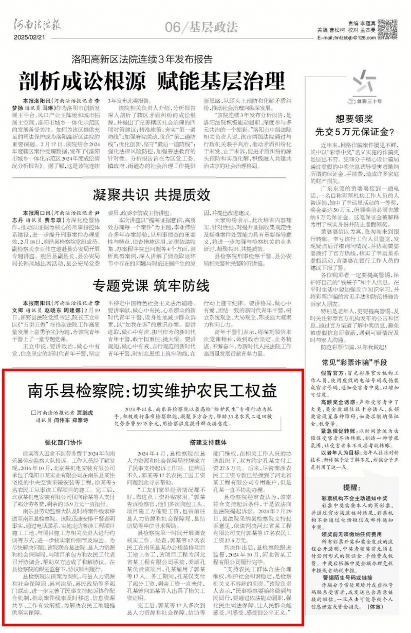 2025年2月21日,《河南法治报》以《南乐县检察院:切实维护农民工权益》为题,报道我院2024年以来,帮助33名农民工追回被欠劳务费59万余元的经验做法。