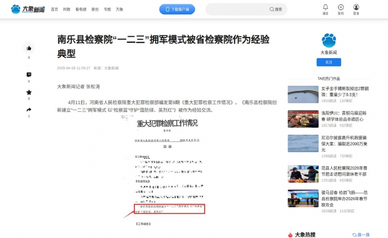 2025年4月28日,《大象新闻》以《南乐县检察院“一二三”拥军模式被省检察院作为经验典型》为题,报道我院依托“涉军维权法律服务工作站”建立“一二三”拥军模式的创新举措。