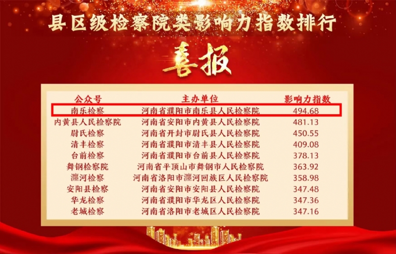 据悉,此前在全省检察院微信公众号影响力2023年上半年排行榜榜单中,“南乐检察”位列第11名,在全省县级检察院中排名最高。