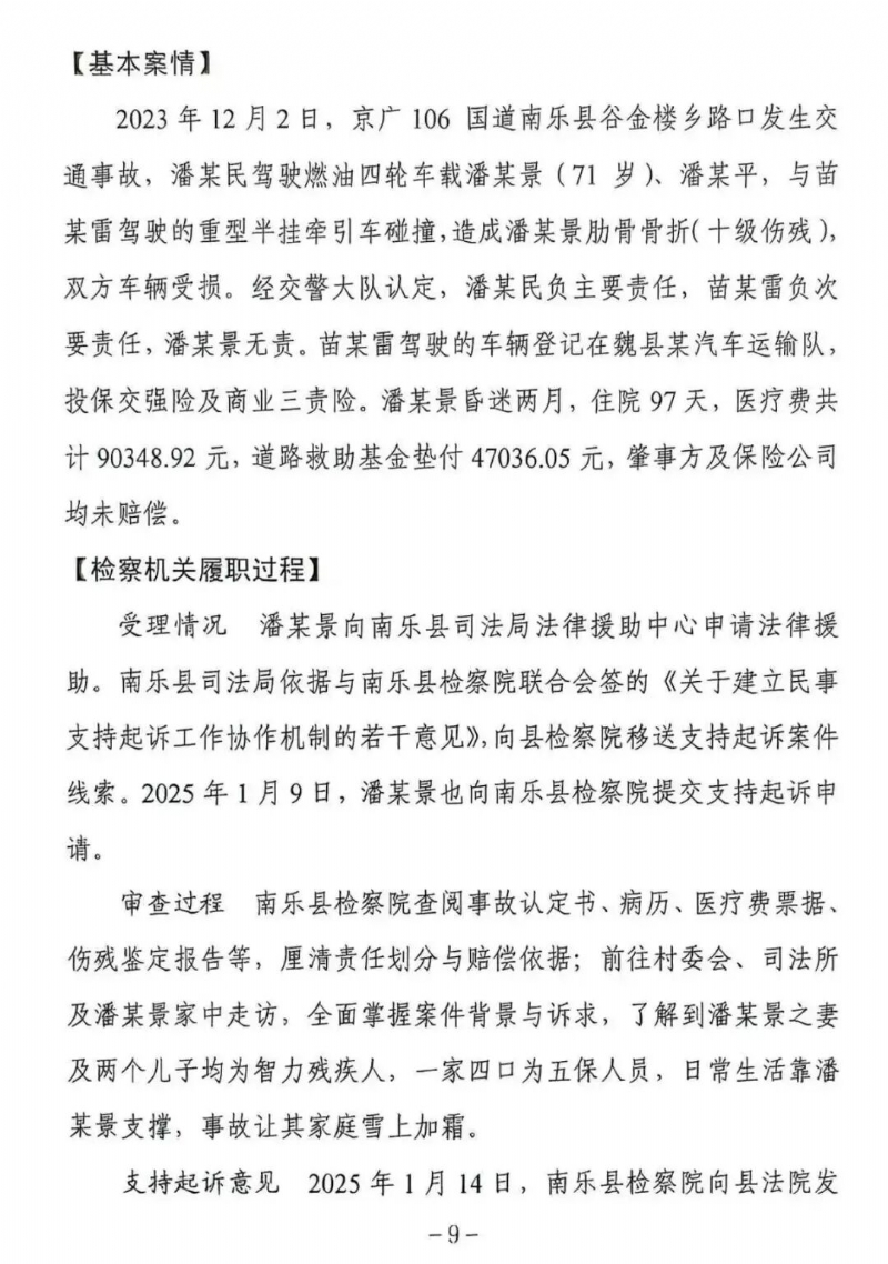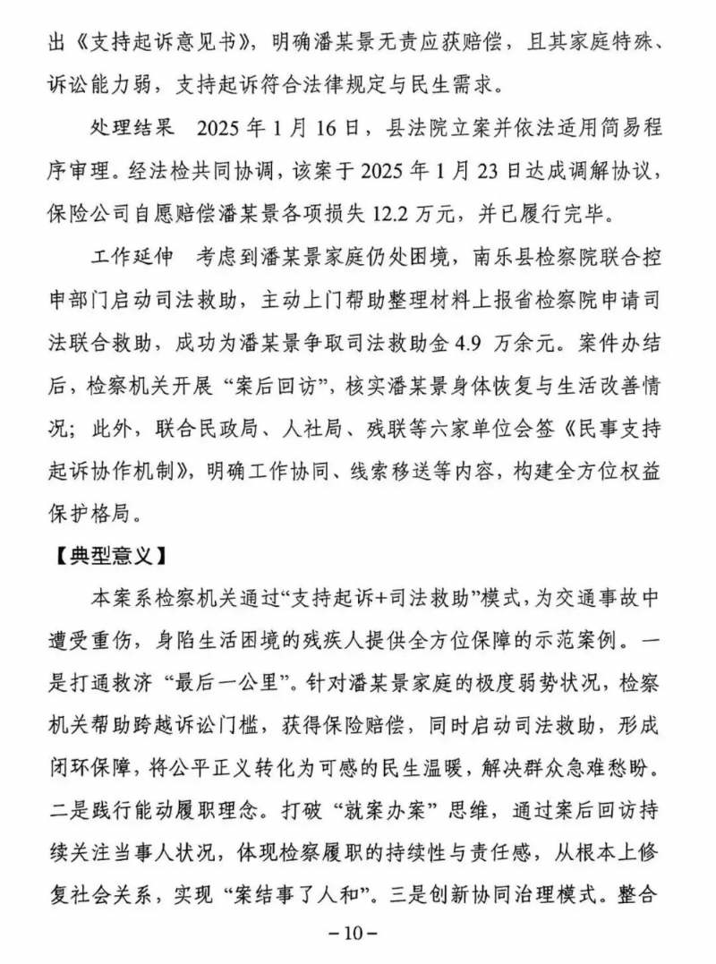 近日,河南省检察院第六检察部发布全省《民事支持起诉业务工作交流案例》,共选编了6件民事支持起诉案例。其中,南乐县检察院办理的“潘某景机动车交通事故责任纠纷支持起诉案”入选交流案例。
