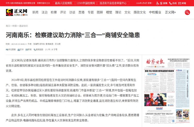 2025年5月23日,《正义网》报道我院向某镇政府提出检察建议,助力辖区内消除“三合一”商铺安全隐患的工作做法。