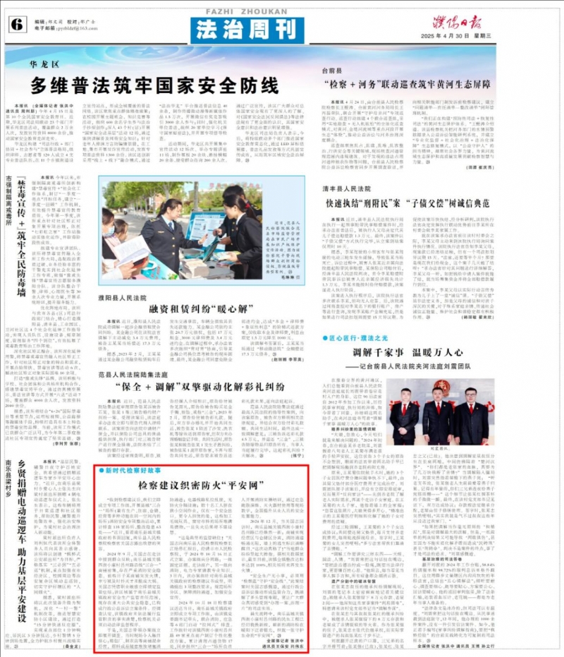 2025年4月30日,《濮阳日报》以《新时代检察好故事 检察建议织密防火“平安网”》为题,报道我院通过行政公益诉讼推动形成监管合力的司法效果。